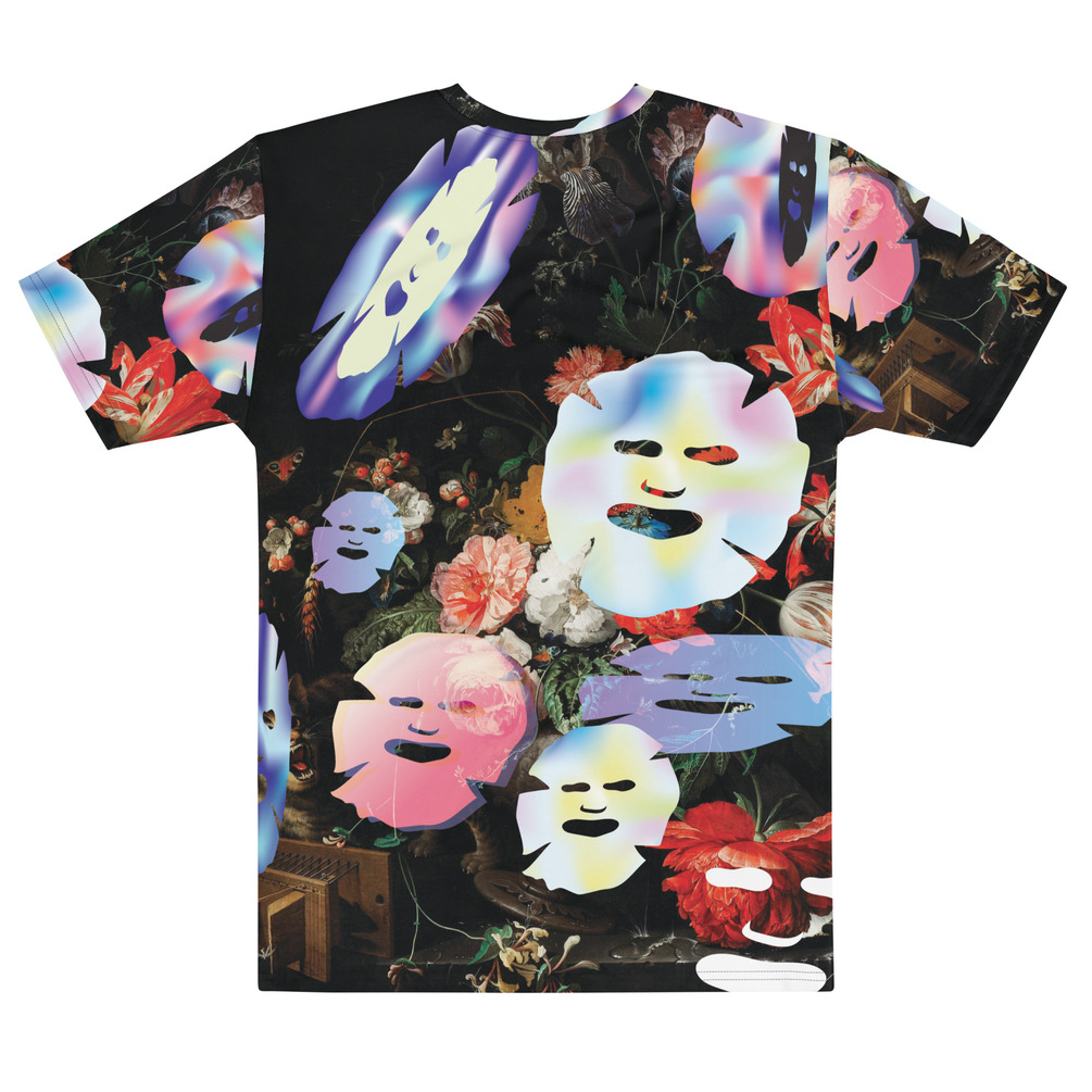 Double-sided all-over print t-shirt featuring many sheet masks floating over a painting of a floral bouquet. Like your beautiful face, the flowers are fresh in their youth. The fit is unisex.