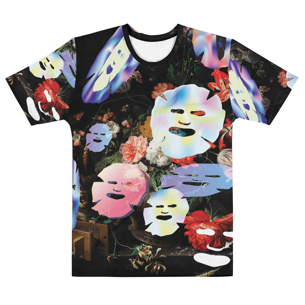 Double-sided all-over print t-shirt featuring many sheet masks floating over a painting of a floral bouquet. Like your beautiful face, the flowers are fresh in their youth. The fit is unisex.
