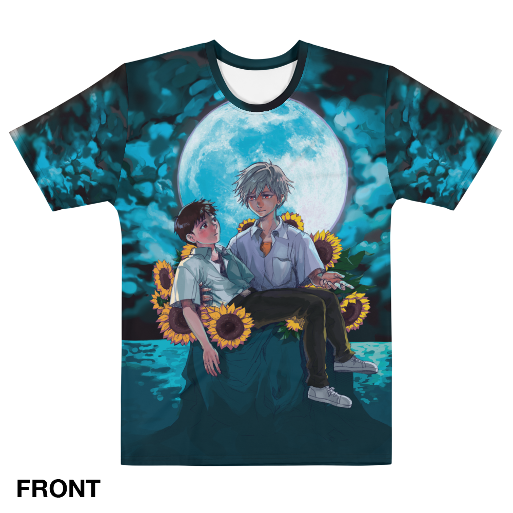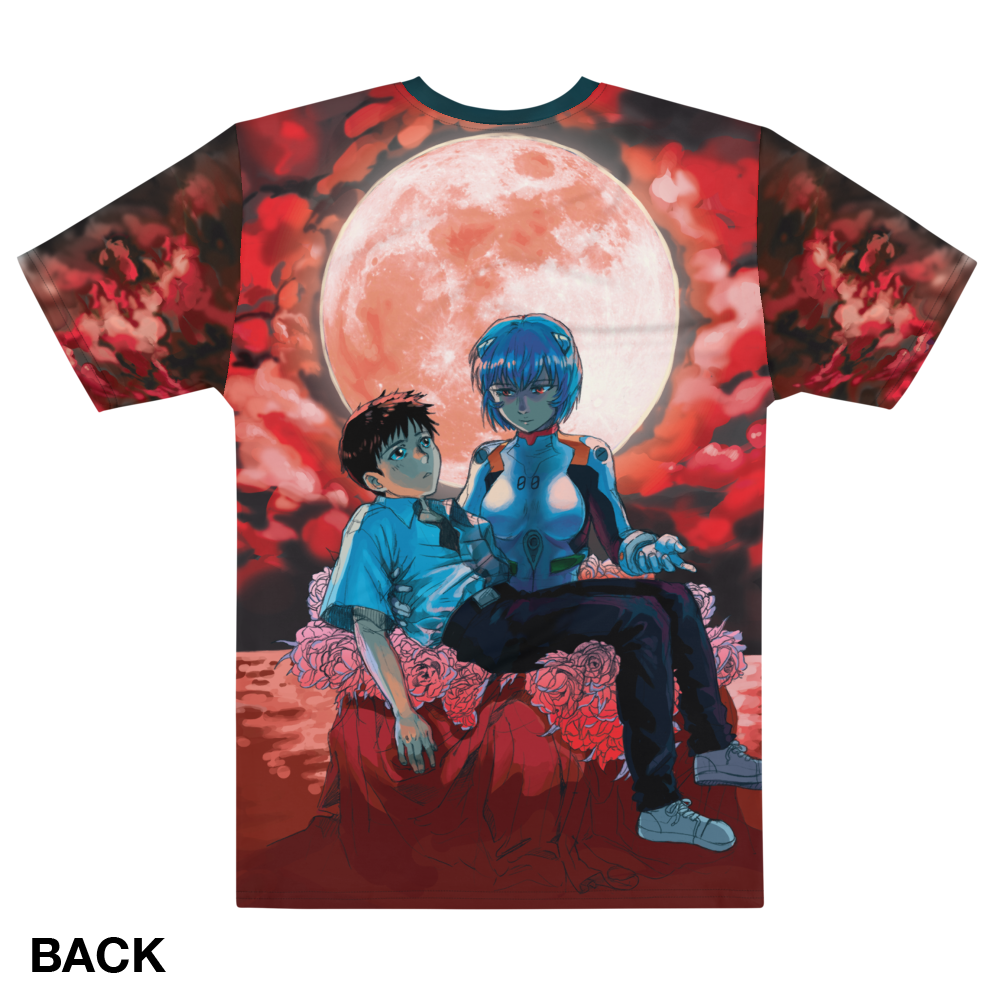 Double-sided all-over print t-shirt featuring Evangelion characters in the pose of Michelangelo's Pieta. The back has Kaworu holding Shinji on a blue background. The back has Rei holding Shinji on a red background. The fit is unisex.
