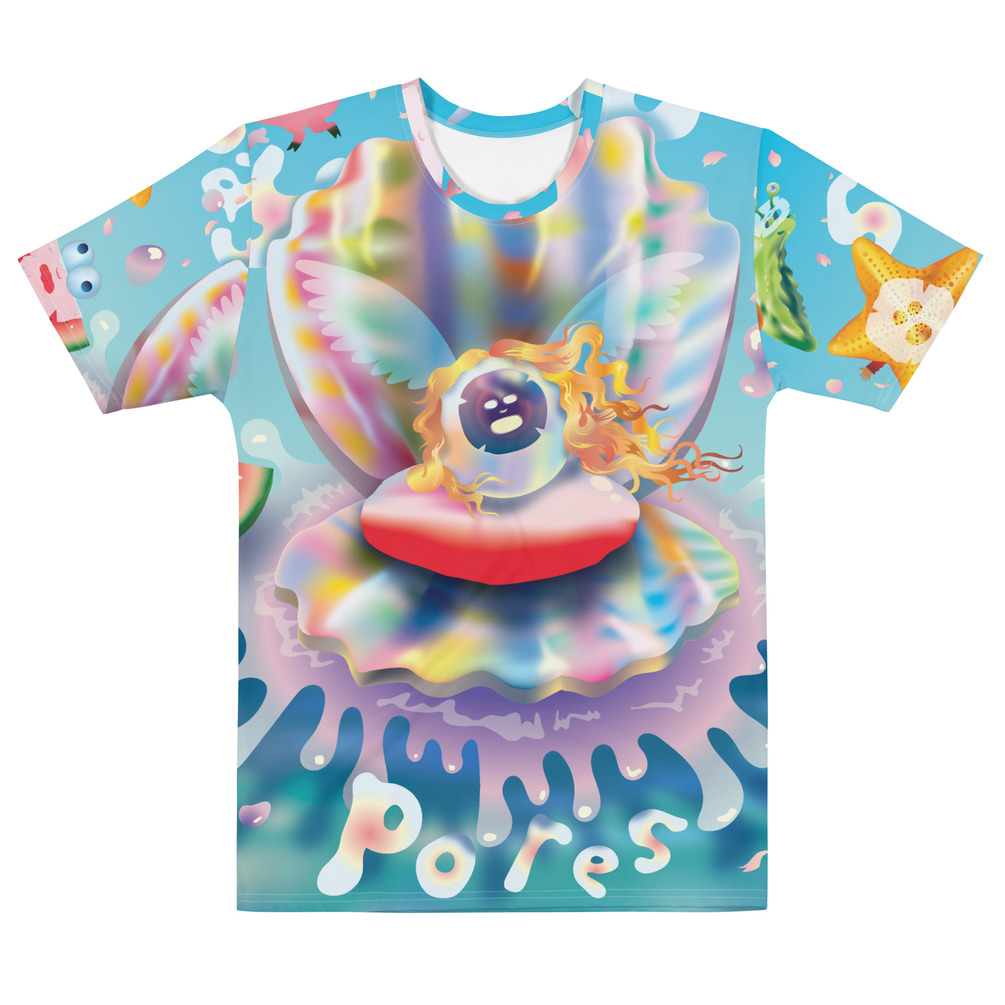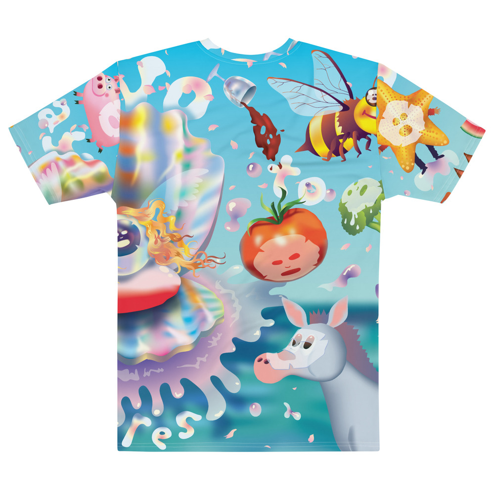 Double-sided all-over print t-shirt featuring many colorful creatures wearing rejuvenating sheet masks to plump up their face skin. The fit is unisex.